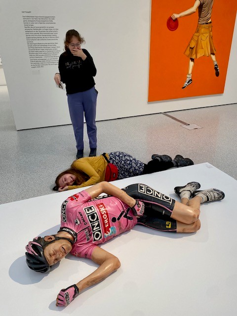 Dabei wurden die ausgestellten Werke nicht nur angeschaut, sondern gleich auch nachgestellt. Eine Betrachtungsart für alle Sinne! Dass dabei auch der Spass nicht zur kurz gekommen ist, zeigt das Bild deutlich.