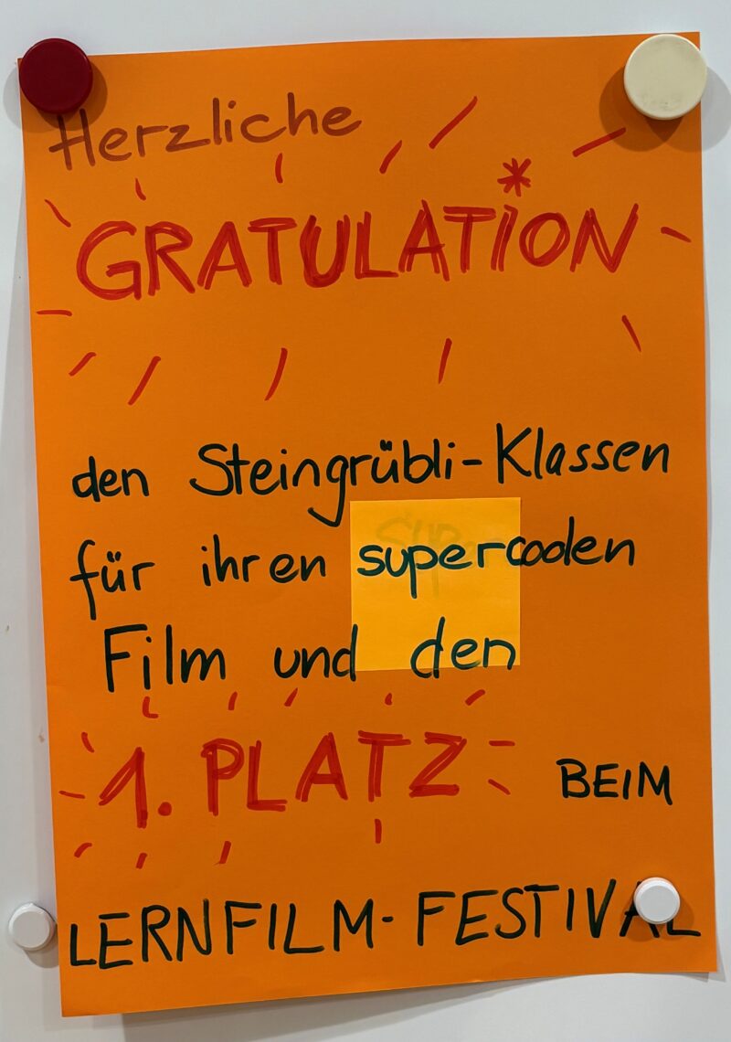 Den grossen Moment der Preisverleihung verfolgte die Klasse am Bildschirm. Gross war die Freude, als die Jugendlichen aus dem Steingrüebli-Schulhaus als Gewinner*innen genannt wurden. Herzliche Gratulation an alle, die zum Gelingen dieses Projekts beigetragen haben!