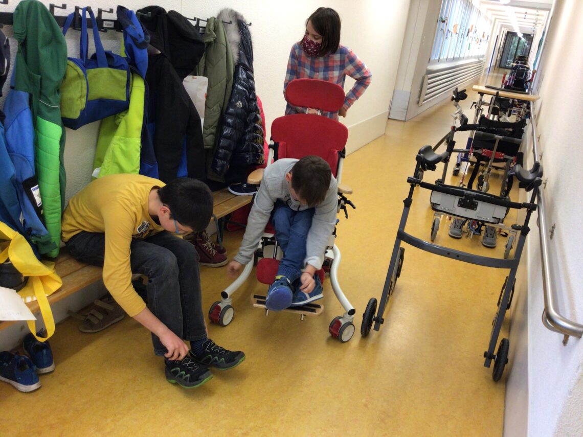 Nehmen wir einen typischen Schultag von Primarschüler Ben. Wenn Ben mit dem Elektrorollstuhl ankommt, benötigt er genügend Platz, um in Ruhe auszusteigen. Im Eingangsbereich braucht es einen Besammlungsort, an dem Ben vom Elektrorollstuhl in den Handrollstuhl wechseln kann. Anschliessend benötigt er eine ausreichend grosse Garderobe, damit er beim Ausziehen der Jacke und des Schultheks einen sichern Sitz in seinem Rollstuhl hat. Im Klassenzimmer profitiert Ben, wenn er Platz vorfindet, um gelegentlich von seinem Rollstuhl auf den Boden zu wechseln, damit er ein Buch lesen oder einem Kreis beiwohnen kann. Dabei sammelt er wertvolle Bewegungserfahrungen. Lernen beinhaltet das vielfältige Miteinbeziehen des gesamten Körpers. In den Pausen freut sich Ben über Räume und Nischen, in die er sich zurückzuziehen oder mit seinen Gspänli plaudern kann. Für seine Therapien ist ein Einzelraum ideal. Darin hat Ben mehr Privatsphäre und wird weniger von anderen Kindern abgelenkt, die gleichzeitig in der Therapie sind.